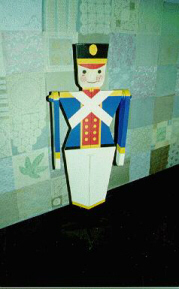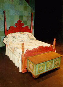 The backdrop is a scrim quilt over a steel frame. Rope lights followed the profile of the house, giving a lovely effect when they were lit. The Raggedy Ann doll was found by Ed Wittstein out of town, but we built the rocking horse and the boat. The bear was custom made on order from the Enchanted Forest in NYC. He almost didn't make it to the stage when Anthony's roommate attempted to kidnap him.